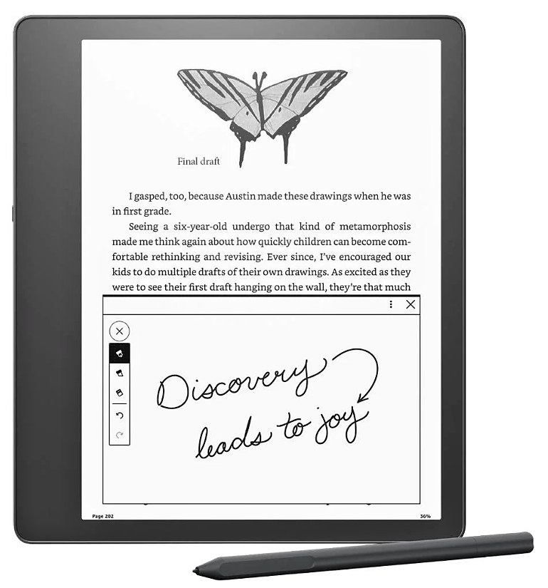 Čtečka knih Kindle Scribe 2022 Vám umožní číst a psát jako byste v ruce drželi skutečnou knihu nebo sešit. Tento model rozhodně neslouží jen pro zábavu, s jehož pomocí můžete procházet pracovní dokumenty, prezentace i studijní materiály, aniž by vás z toho bolely oči. Díky prémiovému peru si navíc můžete zapisovat poznámky, kreslit nebo zvýrazňovat části textů přímo v dokumentech.